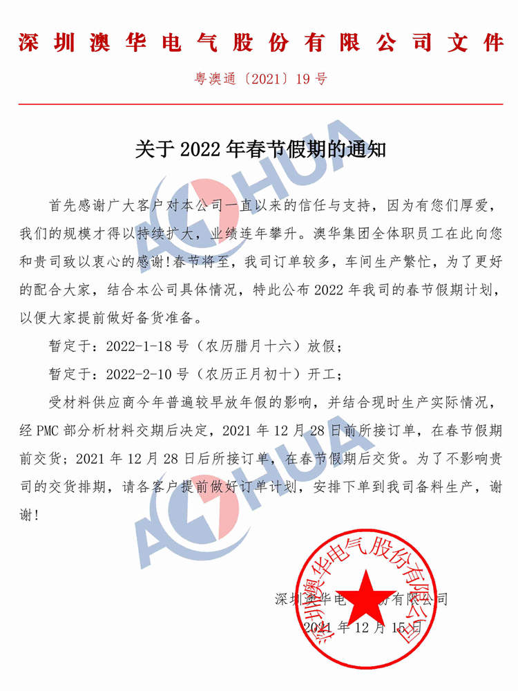 澳華全體員工感謝廣大新老客戶長期以來的支持與信賴,以下是我司2022年春節(jié)放假時間安排,請廣大客戶朋友結(jié)合實際情況提前做做好備貨準(zhǔn)備,謝謝!